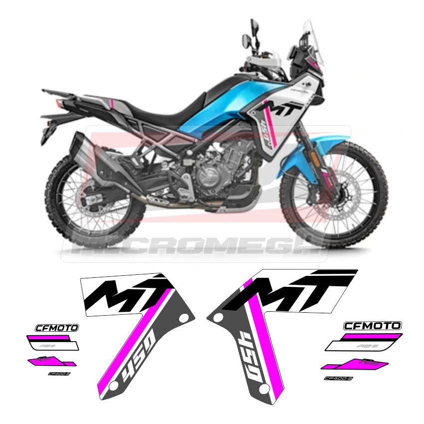 Kit de Calcas Sticker Calcomanías Cfmoto Mt 450 24-25 rosa diseñadas para restauración, fabricadas con los detalles y dimensiones de las originales.
